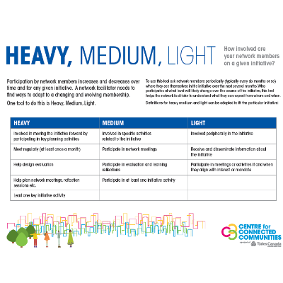 This tool is designed to help clarify the various possible levels of involvement for network members. The capacity, relevance, and interest of network memberships can shift over time, thus being transparent about the flexibility of network involvement is one way to strengthen a network over time.