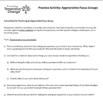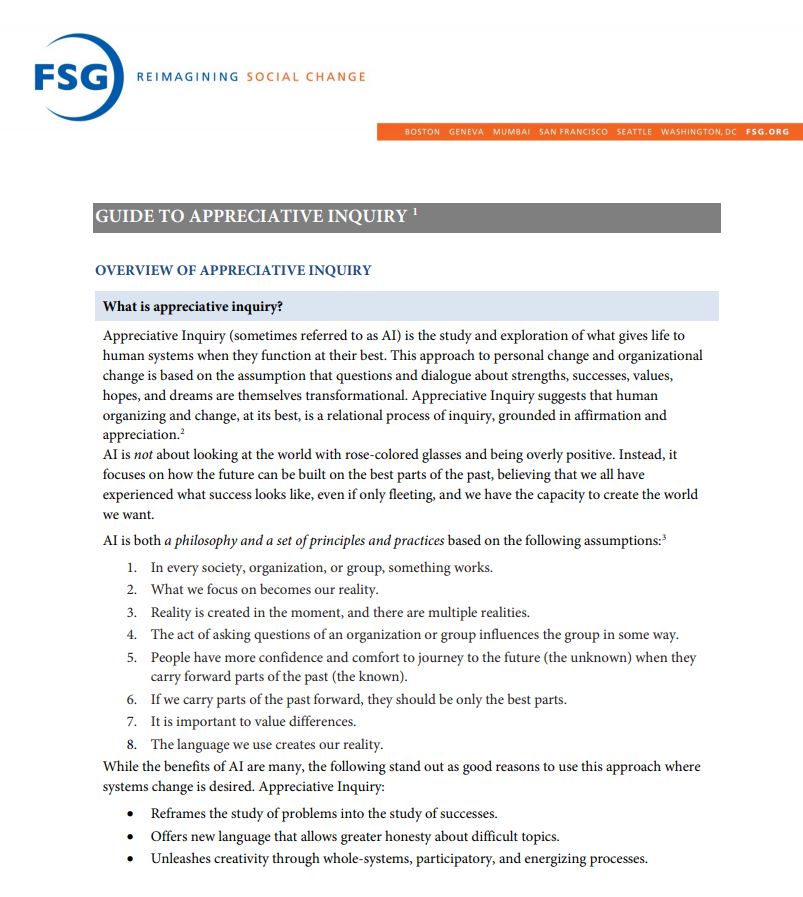 A critical understanding of context and what people are passionate about and working towards is fundamental to successful community building. This in depth tool outlines a process to surface the strengths of a community and the context in which those strengths exist. Appreciative inquiry is a good process to use to build a collective strengths' based strategy or plan.