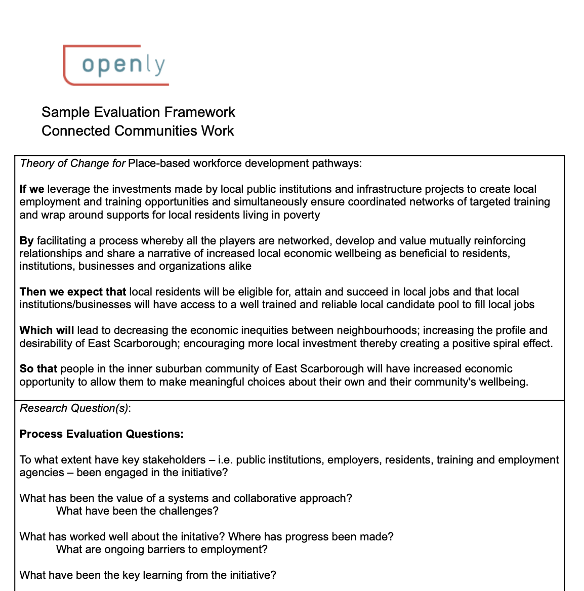 While each community should be intentional about designing evaluation that works best in their local context, the Sample Evaluation Framework, designed by Openly for the original Connected Communities Works (CCW) project in East Scarborough (ESW), offers excellent foundation upon which to build.