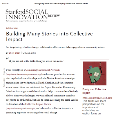 0 Building Many Stories into Collective Impact Author: Sheri Brady Date Uploaded: July 15th 2020 Updated: April 17th 2026 Themes: Equity 10 Keys : Prioritize Equity and Power Sharing Content Level: Light Resource Type: Article Edit Title, Author & Privacy Edit Tags Print View/Download Edit Image Edit Document Collective wisdom is key to creating a connected community. This article provides insight as to why collective wisdom is also an equity issue. Edit Blurb and Video Related Resources We Need Fewer Volunteers and More Community Connected Communities Approach and the 10 Keys White Supremacy Culture Power Dynamics a Systemic Inquiry SYSTEMS CHANGE & DEEP EQUITY: Pathways Toward Sustainable Impact, Beyond “Eureka!,†Unawareness & Unwitting Harm